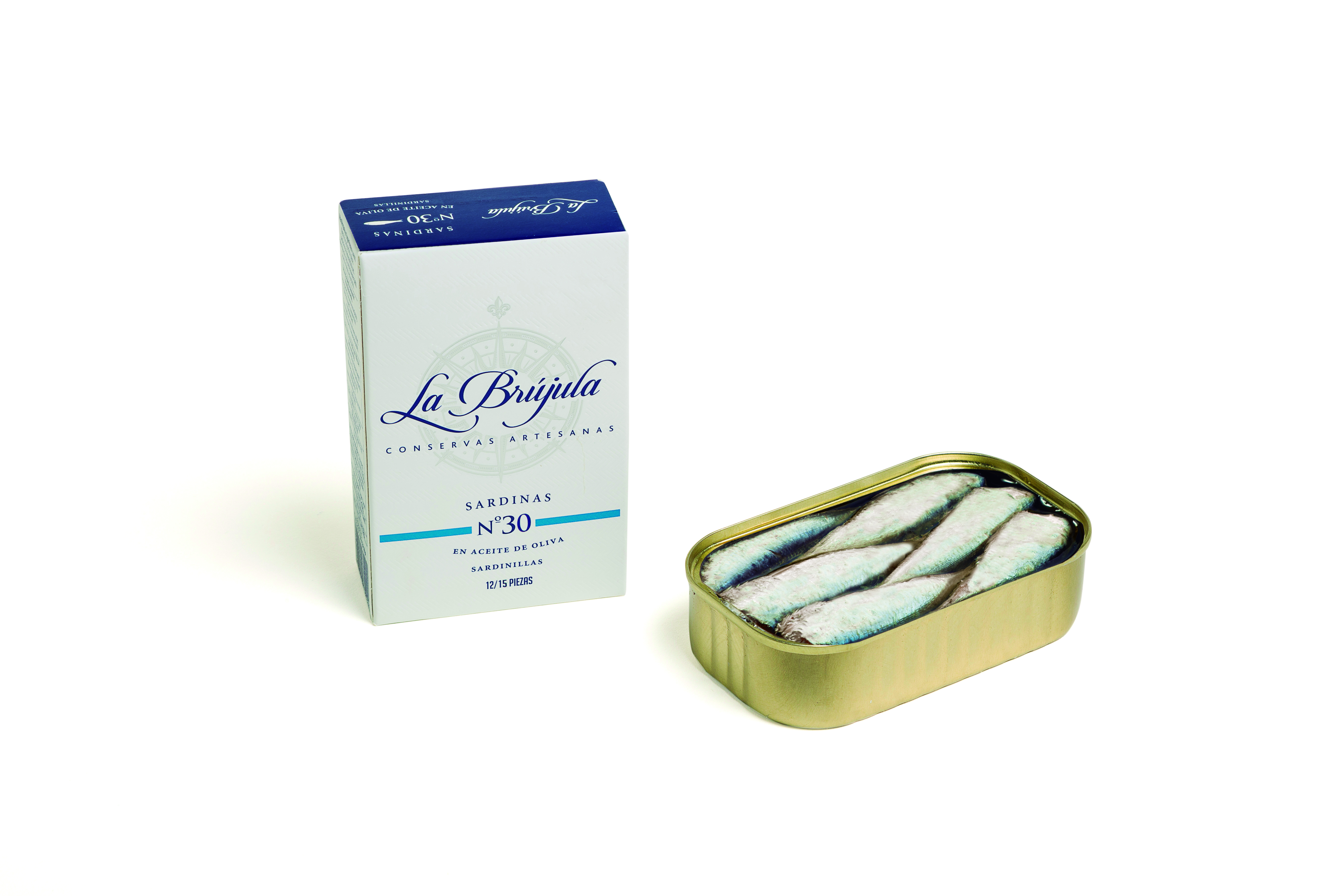 N° 30 - Der Klassiker und insbesondere in Spanien sehr geschätzt, sind die kleine Sardinen (Sardinillas) mit erstklassigem Olivenöl und einem Hauch Salz. Von Juni bis Oktober werden vor der galizischen Küste diese kleinen Sardinen gefangen und in traditioneller Weise, nur leicht gedämpft, verarbeitet. Für Liebhaber des puren Geschmackes, kleine, handgelegte Sardinen der Spitzenklasse aus Galizien. Fest im Biss, feinstes Aroma - so müssen Sardinen schmecken. Zusammen mit ein paar grünen Oliven und einem Baguette der perfekte Begleiter zu einen gekühlten Glas Weißwein.
